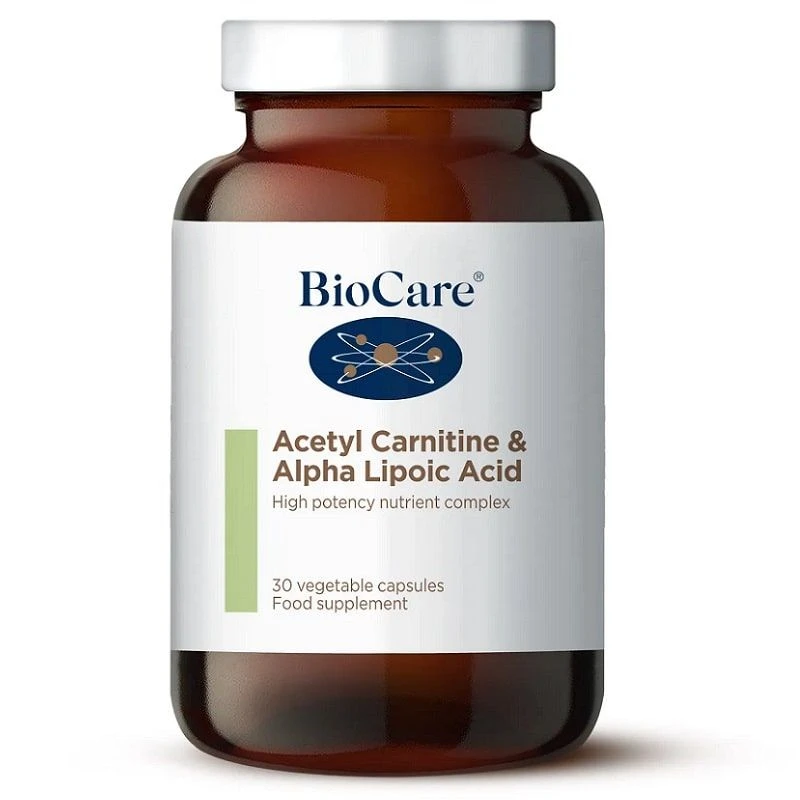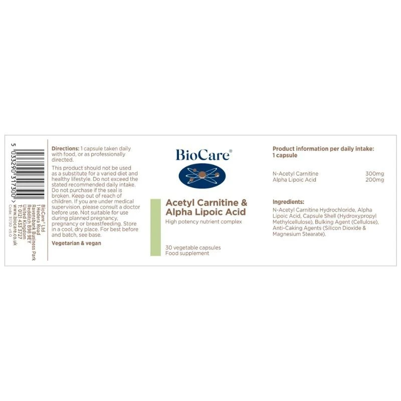 BioCare Acetyl Carnitine & Alpha Lipoic Acid formulation provides 300mg N-Acetyl Carnitine and 200mg Alpha Lipoic Acid in a vegetarian and vegan friendly capsule.