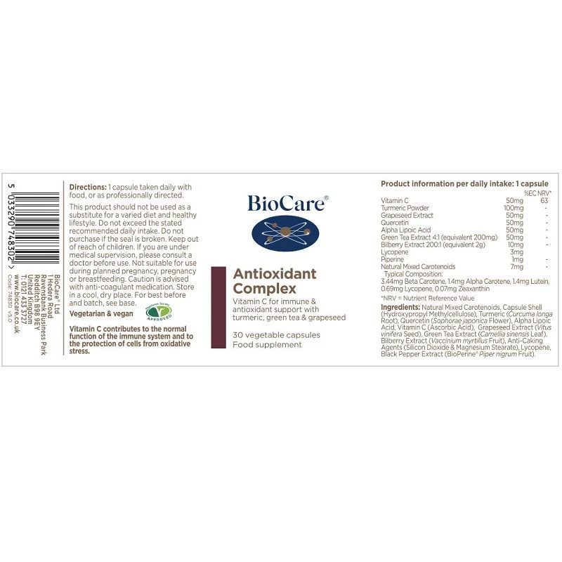 Biocare Antioxidant Complex is a potent and synergistic combination of natural plant extracts including flavonoids and carotenoids, with alpha lipoic acid and vitamin C, providing optimum antioxidant support. Biocare Antioxidant Complex has increased levels of green tea, turmeric and Vitaflavan grapeseed extract, alongside other potent phytonutrients such as quercetin, lycopene, lutein and high strength bilberry extract. Curcumin (turmeric) helps to maintain the immune system and has antioxidant properties.