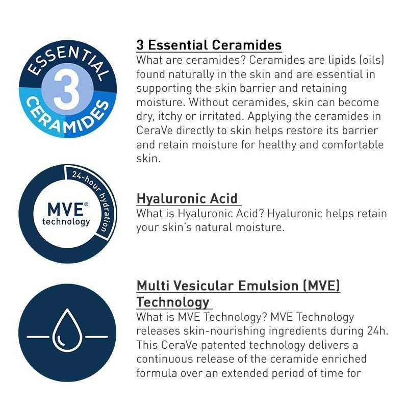 - CeraVe’s MVE delivery technology: A revolutionary system which allows their skincare products to work more effectively. This ‘Timed-Release’ formula provides multiple phases of moisturisation to keep our skin hydrated for up to 24 hours.