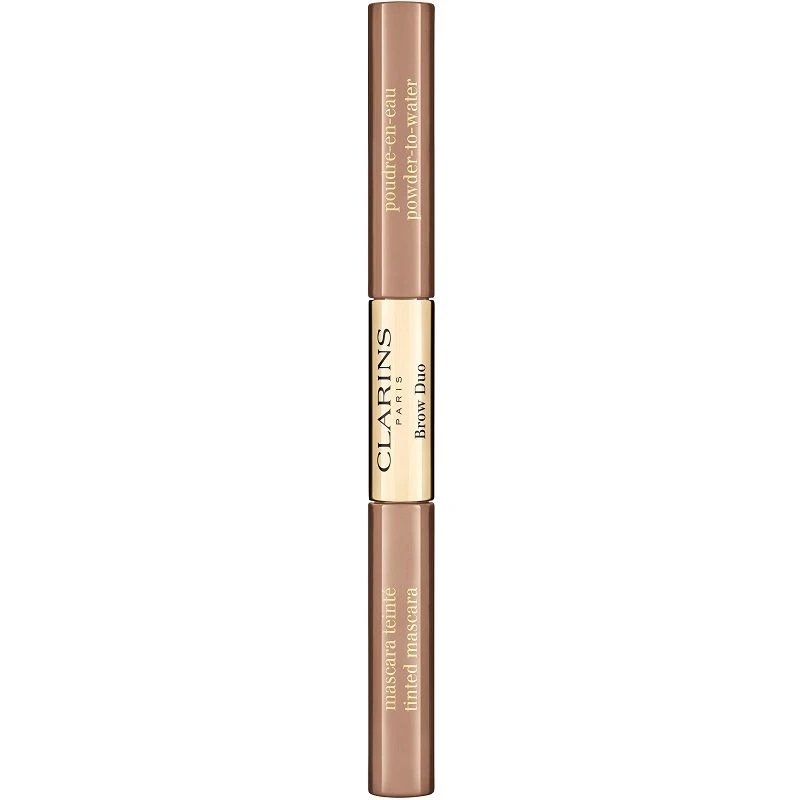 Use the powder tip to sculpt contours and thicken. Apply the mascara brush to intensify and set the shade.
