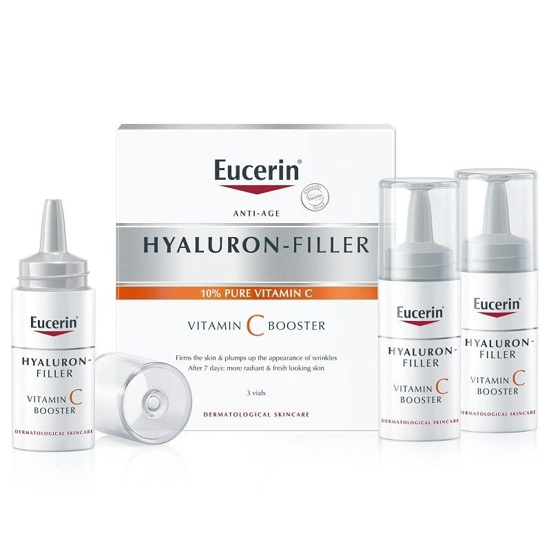The sun, pollution, smoking and other aspects of our lifestyles trigger the formation of free radicals. Free radicals cause oxidative stress to skin, accelerate premature skin ageing and leave skin looking dull. Eucerin Hyaluron-Filler Vitamin C Booster with 10% pure and freshly-activated Vitamin C has been specially formulated to fight free radicals and address the first signs of ageing: it strengthens skin, plumps up wrinkles and gives you a smoother, fresher and more radiant look.