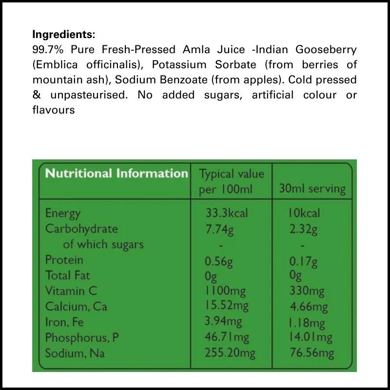 Amla, also known as Indian Gooseberry, is a sour fruit that grows in India and is developed in the wet, hilly territories in autumn. Amla juice has been known in Aryuverda to bring the body into equilibrium and help balance all three doshas – vata, pitta and kapha. Amla juice is considered as the divine fruit for its wide range of benefits. It is a wonderful health juice as it is uniquely rich in Vitamin C content which is 20 times more Vitamin C than an orange.