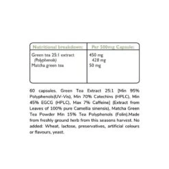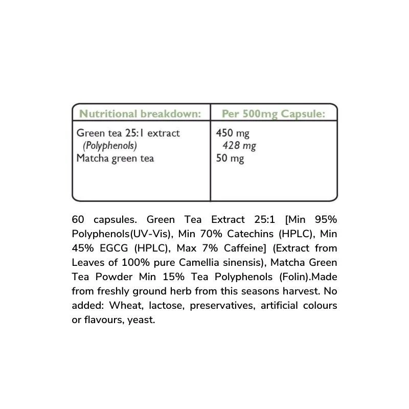 - Green tea- high strength 25:1 extract – equivalent to 11g green tea leaves per capsule. Standardized to contain minimum 95% polyphenols.