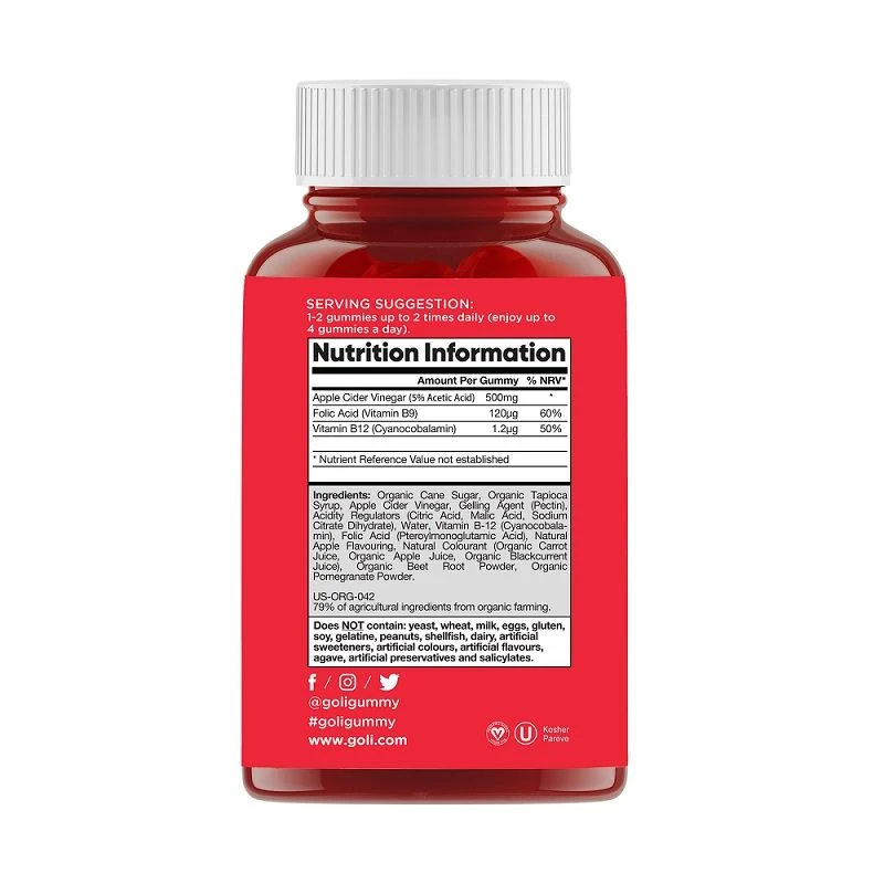 - Real apples, vitamin packed, great taste: Made with real apples, beetroot and pomegranate, Goli Gummies are as delicious as they are good for you. Our vegan friendly formula is packed with Vitamin B12 and B9 that will help improve energy, support healthy skin and so much more.