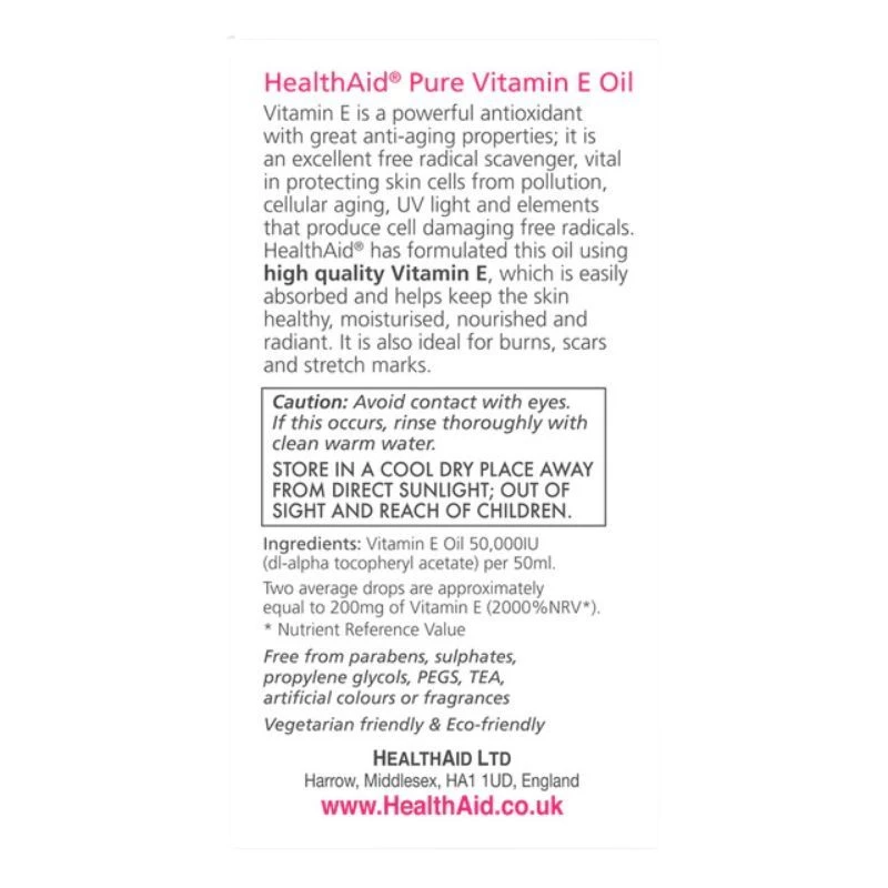 Vitamin E Oil contains Vitamin E, which is a well-known, powerful antioxidant with great anti-aging properties. It is an excellent free radical scavenger, vital in protecting skin cells from pollution, UV light and elements that produce cell damaging free radicals. HealthAid has formulated this oil using high quality natural Vitamin E, which is readily absorbed and helps keep the skin healthy, moisturised, nourished and radiant looking.