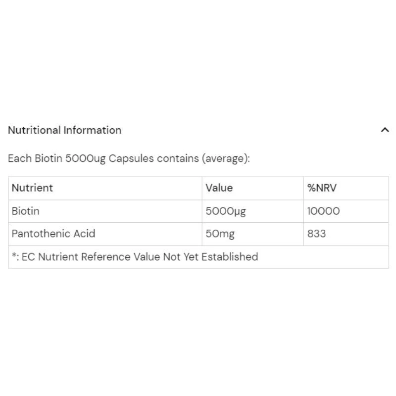 - Since regular Biotin supplementation may lead to Vitamin B5 (Pantothenic Acid) deficiency the HealthAid Biotin 5000mcg Capsules are fortified with high strength Vitamin B5 which contributes to the reduction of tiredness and fatigue, normal mental performance, energy-yielding metabolism, and metabolism of steroid hormones (sex hormones and adrenal hormones), thus promoting hormonal balance in both man and women.