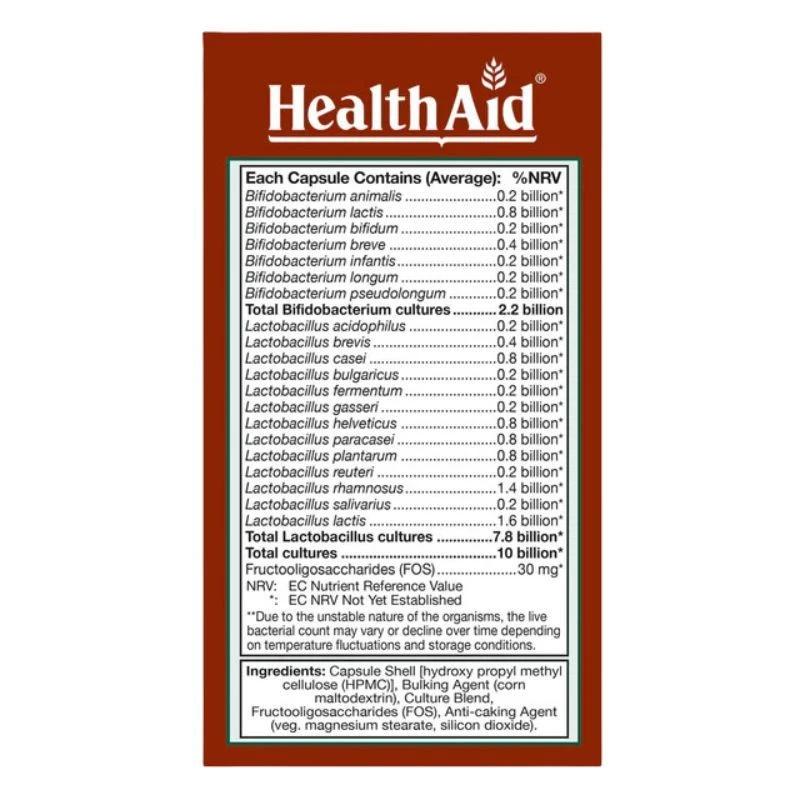 HealthAid DailyProbio is a unique and suggested for daily use formulation containing a superior blend of 10 billion live cultures, using 20 different most researched acid and bile resistant strains to ensure that the bacteria are not destroyed by the stomach juices before they reach the intestines.