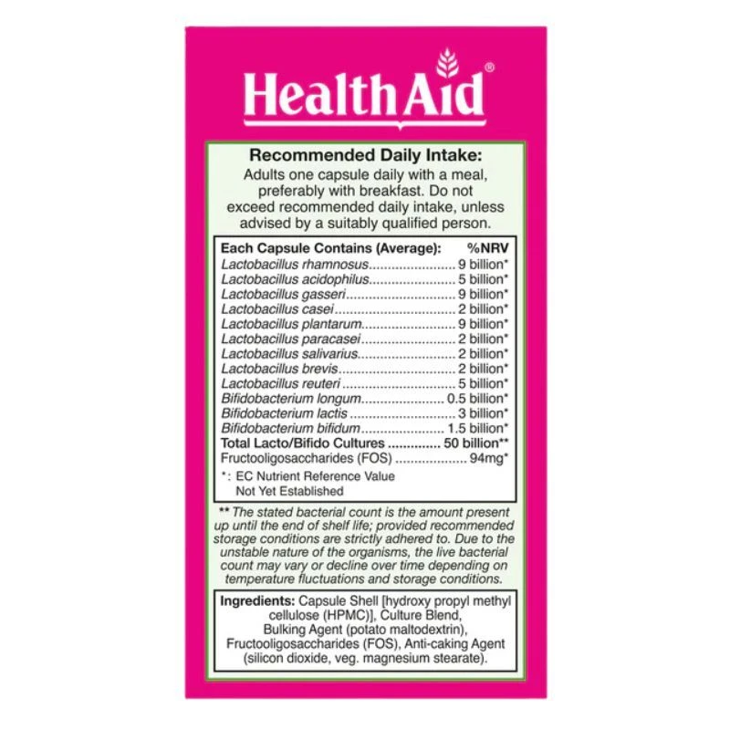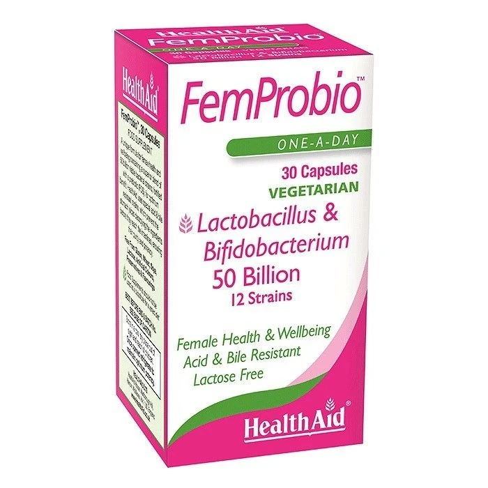 A unique formulation especially for women, containing a superior blend of 50 billion viable bacterial strains; fortified with a prebiotic (FOS), to aid optimum vaginal health, restore yeast balance and maintain urinary health. This high strength dose of 50 billion probiotic cultures provides a natural defense against unwanted harmful yeast and bacteria that cause infections such as thrush (candidiasis) or cystitis (urinary infection). FemProbio also helps provide a balanced gut flora to ensure good digestion and help support healthy immune function. HeathAid FemProbio uses special acid & bile resistant strains, which prevent the stomach juices destroying the ingredients before they reach the intestines, ensuring their purity and potency.