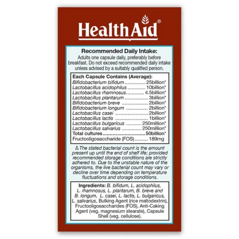 A key to good digestive health and overall well-being is the maintenance of a healthy bacterial balance in the body. Poor diet, stress, alcohol and antibiotics can upset the gastrointestinal tract by destroying good bacteria and allowing undesirable bacteria to multiply. HealthAid ImmuProbio is a unique formulation containing a superior blend of 50 billion viable bacterial strains, fortified with a prebiotic (FOS), to help replenish the body’s good bacteria and maintain a healthy immune system. HealthAid uses special acid & bile resistant strains, which prevent the stomach juices destroying the ingredients before they reach the intestines, ensuring their purity and potency.