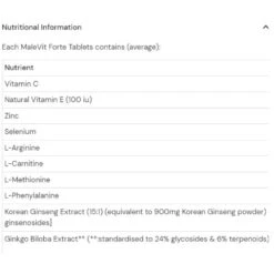 Malevit Forte tablets contain a synergistic blend of essential vitamins, minerals and amino acids with Korean ginseng and Ginkgo biloba, to provide a natural aphrodisiac formulation, offering comprehensive nutritional support for all aspects of male sexual function.