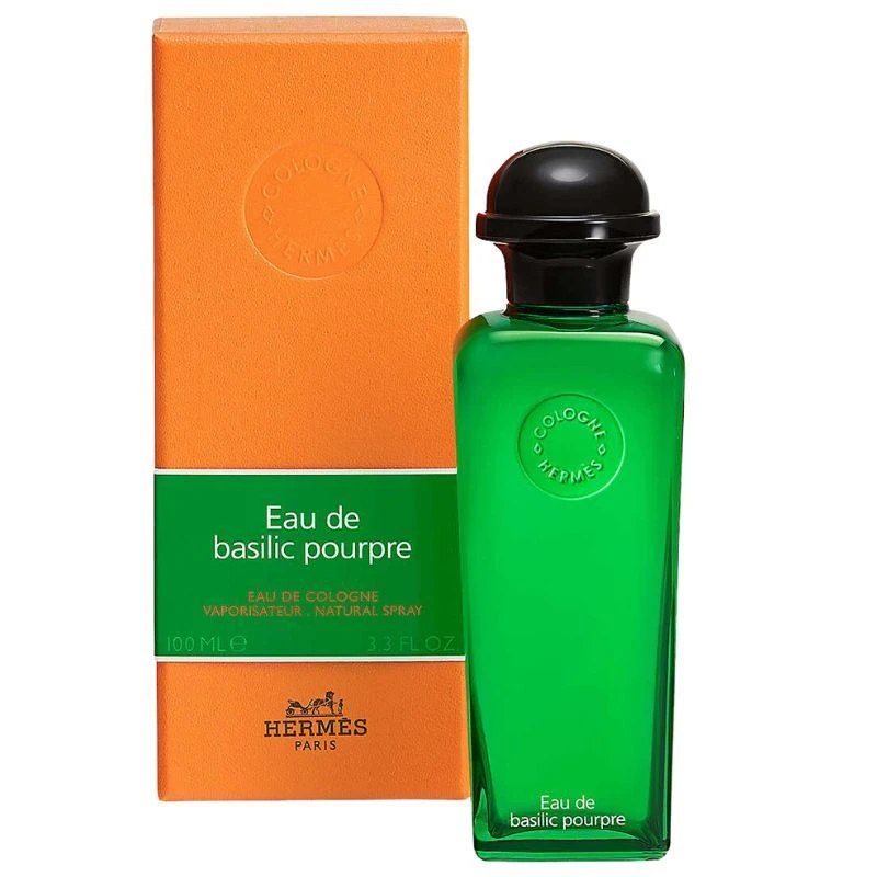 Eau de basilic pourpre expresses the deep and generous aromatic freshness of purple basil, enlivened with light, crystalline green bergamot and geranium to lend character. OBJECT The iconic lantern bottle is dressed up in a luminous green that vibrates with color. The orange box is adorned with a contrasting green band that echoes the color of the bottle.