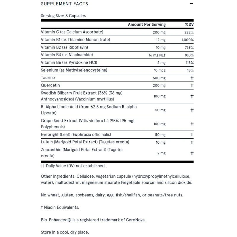 R-Alpha Lipoic Acid, Selenium and Vitamin B2 support levels of the body’s master antioxidant, glutathione, and cellular antioxidant defenses for the eyes’ lenses.*