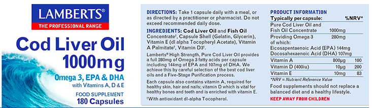 The most important ingredients in cod liver oil are the Omega 3 fatty acids called EPA and DHA, and this one-a-day product from Lamberts has higher levels of these two healthy nutrients than you will find in most shop-bought cod liver oil products. Lamberts® high strength cod liver oil capsules are manufactured in the UK in factories working to GMP pharmaceutical standards.
