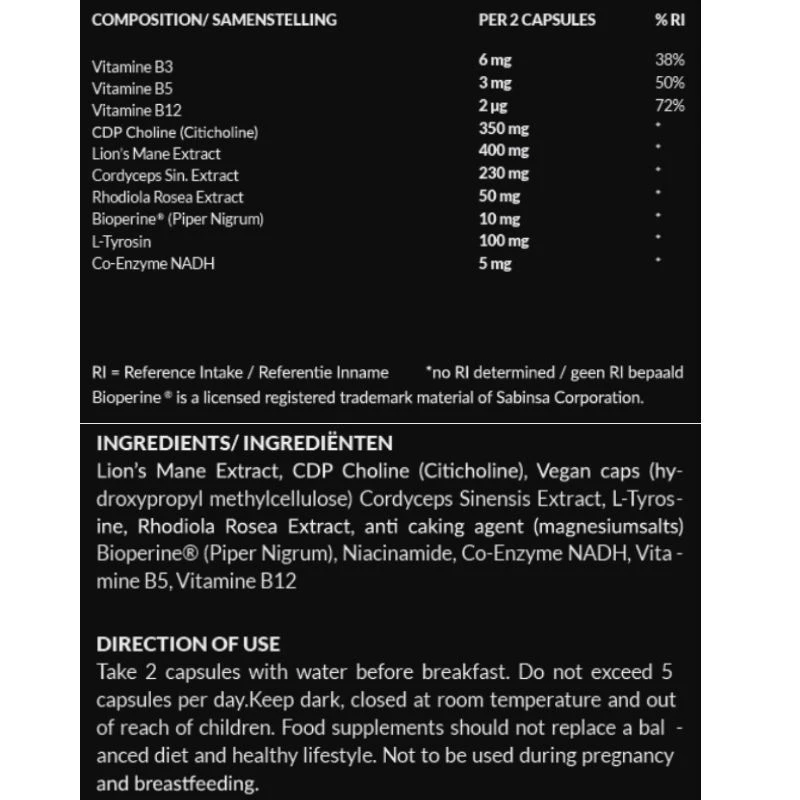CLEAR FOCUSâ„¢ CAFFEINE FREE is all the best of your favourite nootropic but without the caffeine. European legislation recommends consuming no more than 400mg of caffeine per day. Do you already drink a lot of coffee or do you consume other caffeine-rich supplements during the day? Or are you a bit uncomfortable with caffeine-rich products? Then CLEAR FOCUSâ„¢ CAFFEINE FREE has been specially developed for you.