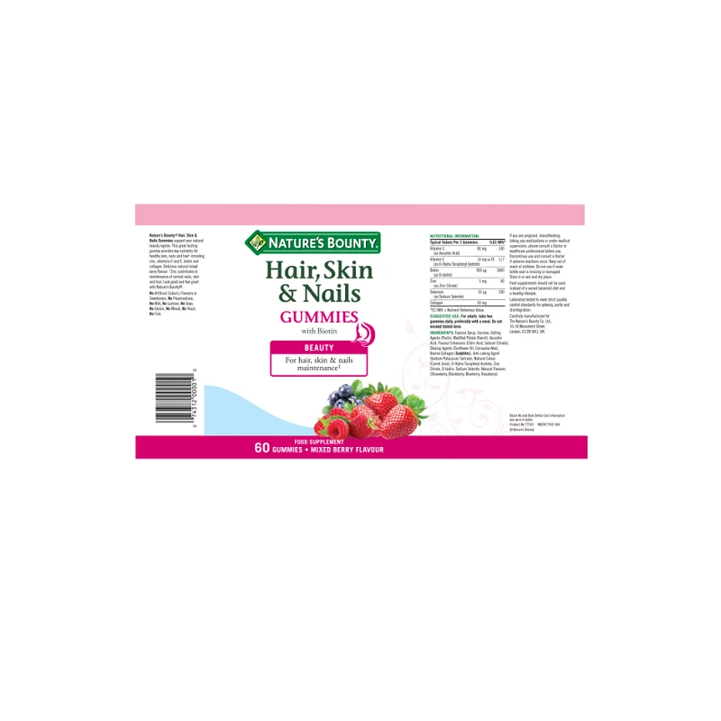 Nature’s Bounty Hair, Skin & Nails Gummies with Biotin support your natural beauty regime. This great tasting gummy provides key nutrients for healthy skin, nails and hair including zinc, vitamins C and E, biotin and collagen. Delicious natural mixed berry flavour. Look good and feel great with Nature’s Bounty.