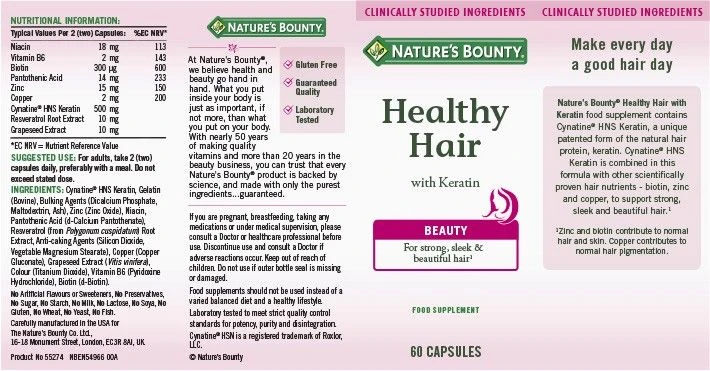 Nature’s Bounty® Healthy Hair with Keratin food supplement contains Cynatine® HNS Keratin, a unique patented form of the natural hair protein, keratin. Cynatine® HNS Keratin is combined in this formula with other scientifically proven hair nutrients – biotin, zinc and copper, to support strong, sleek and beautiful hair.