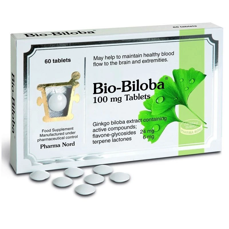 Ginkgo Biloba supplement, Bio-Biloba from Pharma Nord may help to maintain a healthy cardiovascular system, particularly blood circulation to the brain and extremities. The active ingredients of Ginkgo Biloba, flavone glycosides and terpene lactones, have beneficial effects on blood vessel elasticity and blood clotting. They are also powerful antioxidants, particularly effective in protective brain tissue against the damaging effect of free radicals.