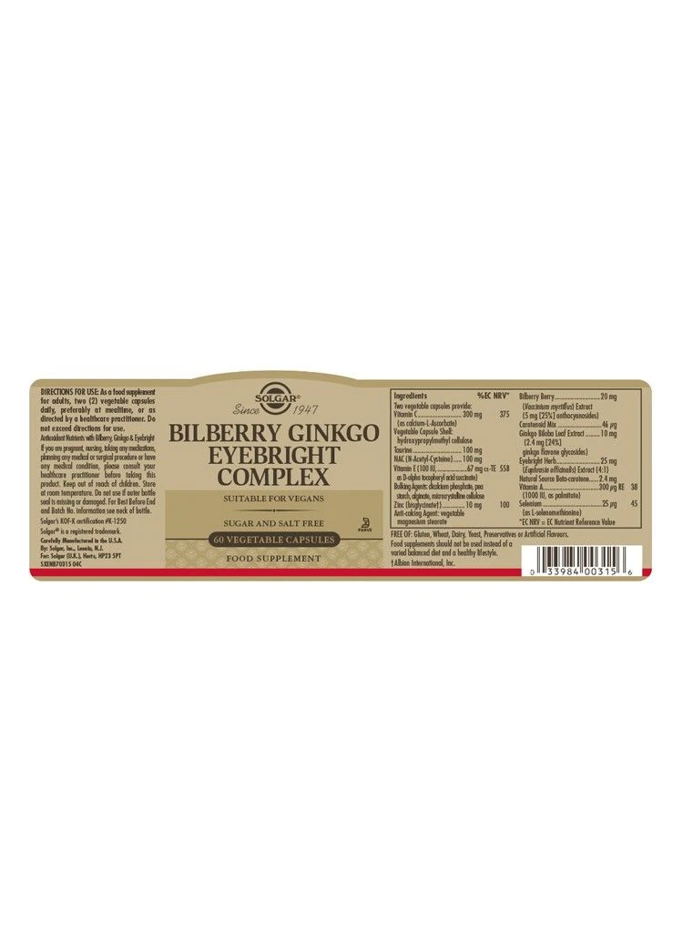 Solgar Bilberry Ginkgo Eyebright Complex is to be taken as 2 vegetable capsules daily and it is suitable for those on a vegan diet. The different sources of antioxidants provide a holistic approach for daily wellbeing.