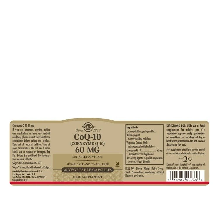 Solgar CoQ-10 (Coenzyme Q-10) 60mg Softgels contains KanekaQ10, a patented form of CoQ10 fermented from yeast and bio-identical to the CoQ10 which is produced by the body.