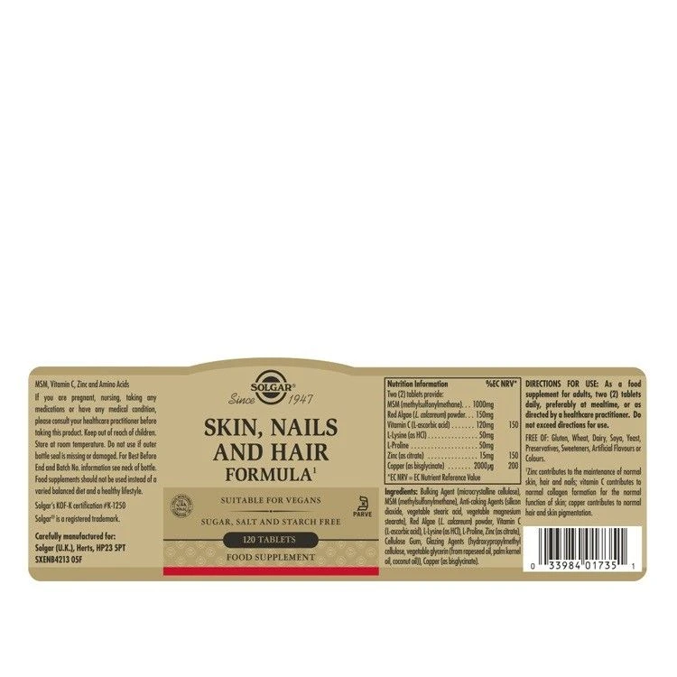 Solgar Skin, Nails and Hair Formula Tablets help to build collagen and keratin, the major building blocks of skin, nails and hair – all of which can decrease as we age and so need a boost of support. It does this with MSM and sulfur compounds, among other vitamins and minerals.