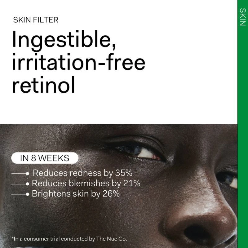 We call SKIN FILTER our “ingestible retinol”. It’s engineered to give you all of the blemish-clearing, skin-smoothing, tone-brightening benefits, without the associated irritation of topical retinol. Formulated with beta-carotene (which your body converts to vitamin A), champagne grape seed, melon, vitamin C and zinc to plump lines, improve sun damage and blur the complexion. It’s skin confidence in a capsule. For best results, continue taking SKIN FILTER for 2 months+.
