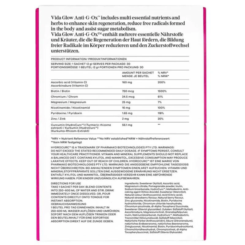 Anti-G-Ox Berry is a daily antioxidant supplement that defends at a cellular level against three root causes of premature ageing. Inflammation, advanced glycation end products (AGEs) and oxidative stress. With a potent blend of actives, the formula enhances skin health, assists healthy sugar metabolism and reduces free radical damage caused by modern life.